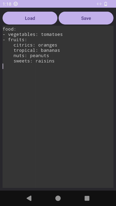 The application has two buttons, the first one (Load) lets us upload a file, if the latter contains text, it will be printed on the screen; on the other hand, the second button (Save) lets us to download a YAML
