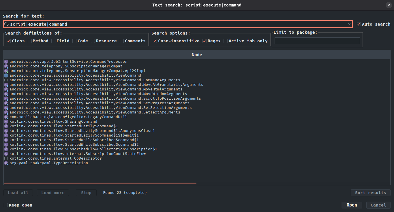 Pressing Ctrl + N in jadx, we can filter classes based on their names. In this case, we can type a regular expression that contains the name of relevant classes if they exist:
