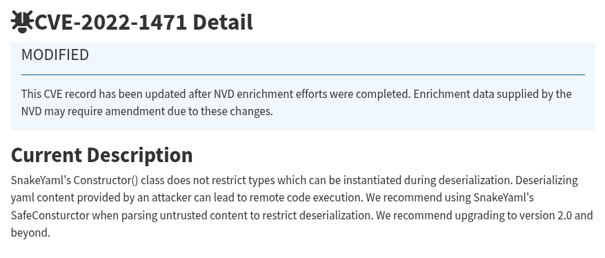 Doing a quick search we can find a SnakeYAML CVE that involves remote code execution as long as the application uses an insecure constructor to deserialize the input file’s content: